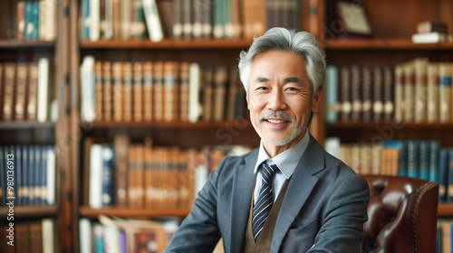 people, man, bookcase, luxurious, aged, 50's, 60's, asian, japanese, suit, business suit, indoor, room, teaching, instructor, teacher, director, smile, smile, archive, office, lawyer, tax advisor, accountant, expert, book, acquaintance, reading, image, portrait, work, office, occupation, light, cravat, smile
