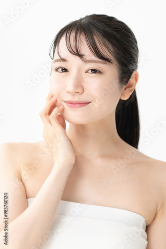 woman, people, japanese, este, hand, girl, young, clean, beauty, portrait, lovely, face, waist up, decollete, white background, skincare, beauty, cosmetic, 30s, long hair, japan, beauty, make-up, smile, cheek, middle-aged, toilet water, bare skin, pretty, light, woman, skin, up, smile, foundation