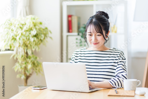 woman, notebook, telecommuting, young, japanese, missy, table, personal computer, examine, seek, seated, search, input, waist up, cyberspace, face, operation, house, home, house, residence, light, refreshing, people, lifestyle, room, indoor, indoor, casual, copy space, condo, select, smile, smile, black hair, 30s, fun, new life, border