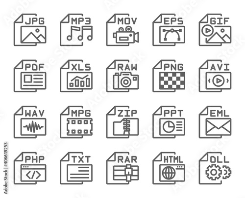 file, line, icon, outline, format, audio, camera, compress, computer, document, editable, electronic mail, film, gif, image, cyberspace, mail, media, motion picture, mp3, multimedia, music, office, photo, picture, set, signs, sound, stroke, symbol, technology, thin, type, vector, video, wav, wave, web, zip
