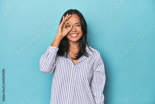 Filipina young woman on blue studio excited keeping ok gesture on eye.