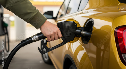 Filling Up Yellow Car at Gas Station with Nozzle with Hand During Daytime