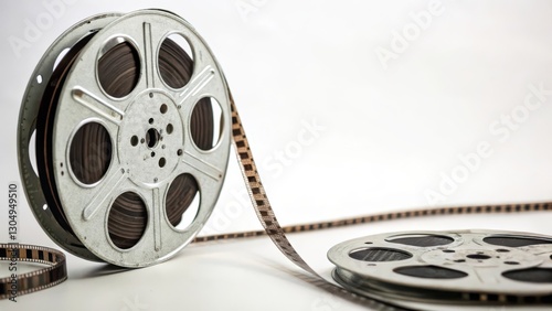 film, reel, motion picture, cinema, cinematography, photo, vintage, classic, old, antique, retro, media, entertainment, technology, analog, spool, silver, metal, disrobed, celluloid, frame, picture, image, history, nostalgia, white, background, isolated, object, studio, shot, still, texture, closeup, detail, grey, dark, light, contrast