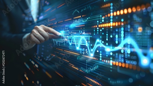 Financial analyst working with digital stock market data visualization and charts, perfect for business technology and investment concepts in modern trading.