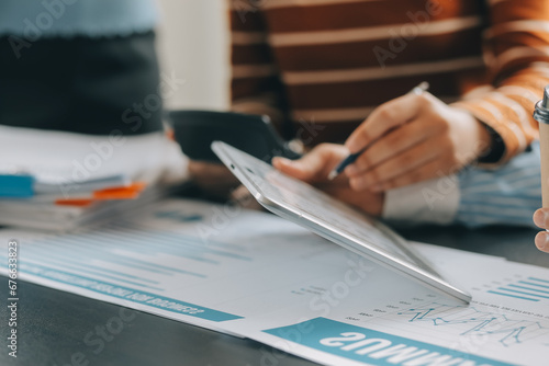 Financial analysts analyze business financial reports on a digital tablet planning investment project during a discussion at a meeting of corporate showing the results of their successful teamwork.