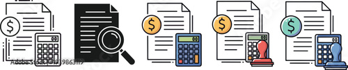 Financial Audit and Accounting Icon Set Featuring Invoice Documents with Dollar Sign Calculator Magnifying Glass and Approval Stamp Vectors