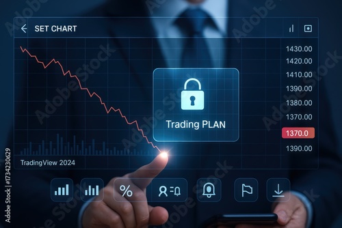 Financial data displayed on a digital screen features a declining chart, a lock icon, and the words "Trading PLAN," indicating a financial strategy with potential risks being visualized.