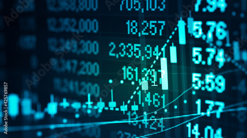 Financial data in term of a digital prices on LED display. A number of daily market price and quotation of prices chart to represent candle stick tracking in Forex trading.