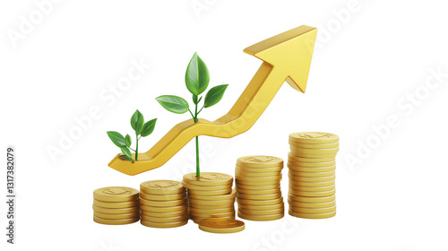 Financial Growth Concept with Stacked Coins, Plants, and Upward Arrow transparent background