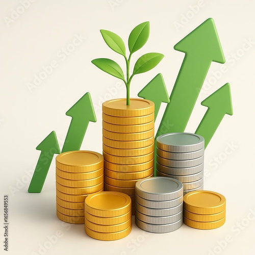 Financial growth represented by stacks of coins and upward trending arrows