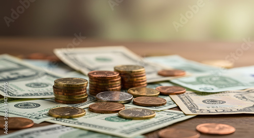 Financial Growth Stacks of Coins and Currency Representing Investment, Savings, and Wealth Accumulation