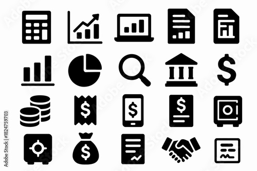 Financial icon set: charts, bank, dollar sign, calculator, safe, handshake