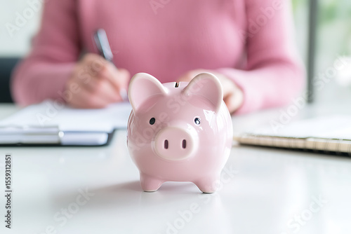 money box, savings, budgeting, investment, finance, money, banking, economy, wealth, investment, cash, currency, deposit, account, income, expenditure, profit, loss, tax, asset, liability, credit, debit, personal finance, retirement, goal, strategy, future, planning, writing, person, desk, document, pink, background, closeup, still life, indoor, workspace, table, loan, fund