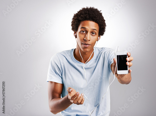Find the best music on this website. Studio shot of a young man wearing his earphones while showing you his cellphone.