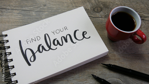 FIND YOUR BALANCE lettering in notebook with cup of coffee and pens