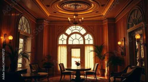 Fine art photograph art deco house interior, bathed in warm, soft light. the scene is luxurious and charming, featuring a soft glow and subtle shadows.