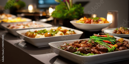 Fine dining buffet catering illuminated banquet table with plated roasted meat and green beans, warm inviting atmosphere