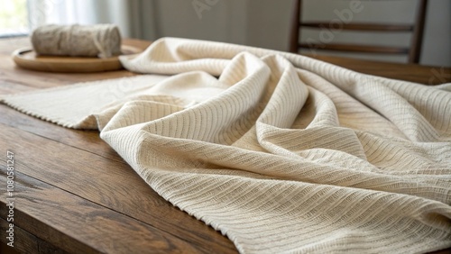 Fine woven cloth with subtle wrinkles and folds, gently draped over a wooden table, textured fabric, organic patterns