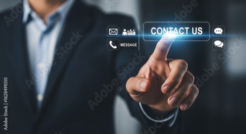 contact, us, communication, message, electronic mail, phone, chat, support, client, service, business, connection, network, digital, interface, technology, virtual, screen, buttons, glowing, bright, hand, finger, pressing, touching