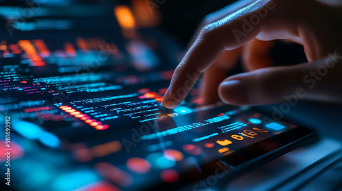 Finger scrolling through a screen of computer code.