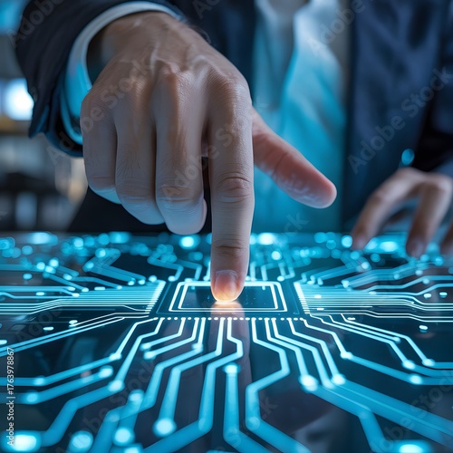 finger, touching, circuit board, glowing, technology, futuristic, digital, innovation, computer, chips, datum, connection, network, electronic, science, engineering, abstract, blue, light, modern, closeup, hand, interaction, system, intelligence