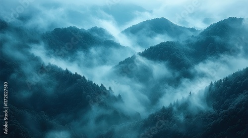 Fingers of mist snake through a jagged mountain range, while the early light casts a gentle glow over the lush greenery, evoking a sense of tranquility and wonder