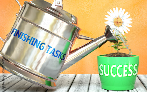 Finishing tasks helps achieve success - pictured as word Finishing tasks on a watering can to show that it makes success to grow and it is essential for profit in life, 3d illustration