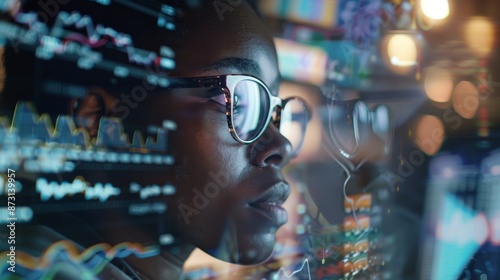 Fintech insight hud, administration, or bank accounting data analysis future screen, statistics, and night lady reading. Financial analyst, face overlay, and African accountant examine company chart