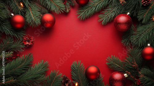 Fir tree branches with red christmas balls frame
