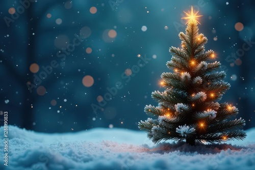 Fir tree surrounded by snowflakes and twinkling lights, decorations,