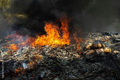 Fire and black smoke. Fire in landfill. Smoke in forest. Illegal landfill.