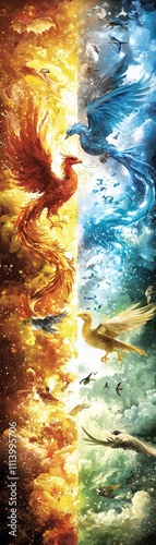 phoenix, fire, ice, water, element, bird of prey, wing, flying, gold, blue, red, orange, abstract, artwork, art, painting, illustration, digital artwork, background, wallpaper, texture, design, graphic, nature, mystical, spiritual, power, energy, balance, opposite, contrast, harmony, duality, legend, folklore, mythology, divine, celestial, cosmic, dreamlike, aethereal, vibrant, colourful
