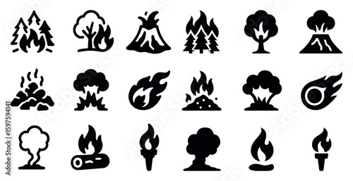 fire, flames, wildfire, forest, natural disaster, silhouette, solid, outline, blaze, emergency, icon, set, vector, nature, environment, heat, combustion, torch, inferno, smoke, ecosystem, hazard, safety, warning, survival, conservation