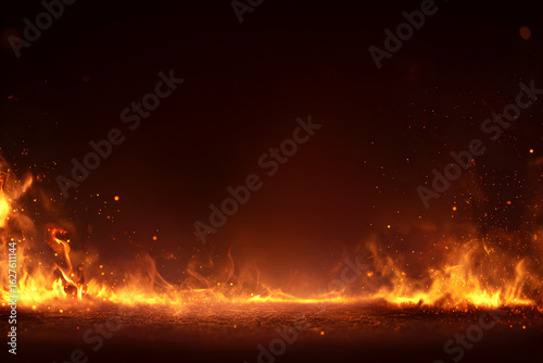 Fire background realistic flames and glowing sparks on dark copy space for banners and ads