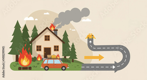 evacuation, fire, car, house, smoke, danger, safety, tree, escaping, emergency, outdoors, road, driving, cartoon, illustration, landscape, flames, rescue, alert, urgency, protection, forest, graphic, vehicle, get-away, summer, risk, alertness, chaotic, natural disaster, fire engine, evacuation route, vivid colors, environmental protection, wilderness