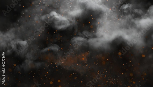 Fire explosion particles flying with black or grey dark smog cloud smoke. Dust texture spray