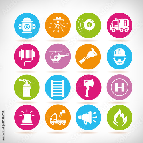 alarm, axe, burn, circle, colours, danger, department, design, emblem, emergency, equipment, extinguisher, fighter, fire, fireman, flames, hat, helicopter, helmet, hook, icon, illustration, light, megaphone, protection, rescue, risk, safety, saviour, siren, speaker, staircase, station, symbol, tool, torch, urgency, vector, water