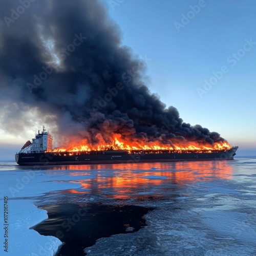 cargo, ship, fire, smoke, ocean, ice, water, sunset, maritime, disaster, emergency, tragedy, red, flames, safety, transportation, industry, pollution, vessel, freight, winter, danger, nautical, crew, marin, wreckage, rescue, boat, fuel, seascape, environment, coastline, horizon, burning, industrial, incident, shipwreck, sea, wave, weather, impact