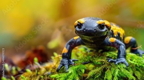 fire, salamander, amphibian, black, yellow, moss, green, nature, wildlife, animal, reptile, forest, closeup, macro, photo, habitat, wet, skin, eye, spot, pattern, fauna, vertebrate, wild, natural, environment, outdoors, blur, background, sharpened, detail, beauty