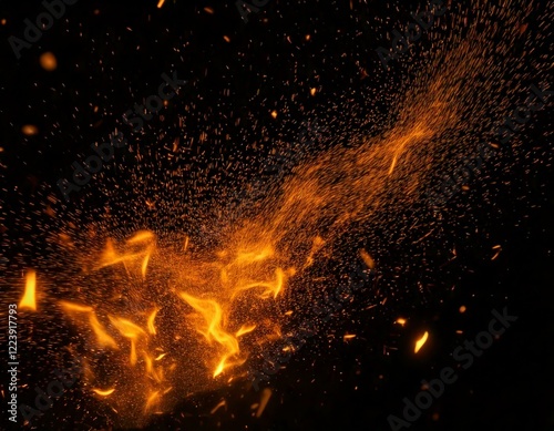 Fire sparks flying like particles on black background. Abstract