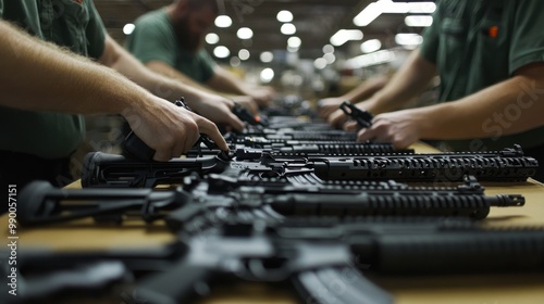 manufacturing, assembly, firearm, rifle, handgun, precision, craftsmanship, men at work, production, industrial, skilled, factory, labor, technology, equipment, quality, safety, tool, assembly line, teamwork, machinery, innovation, material, component, expertise, inspection, design, performance, process, engineering, customization, protection, dynamic, workflow, logistic, responsibility, fabrication, competence, detail, training, efficiency, dependability, functionality, advancement