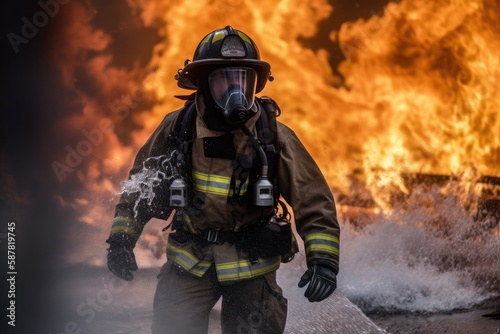 Firefighter battling a blaze with water. The image conveys a sense of courage, bravery, and the importance of public safety Generative AI
