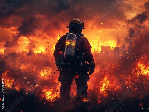 firefighter, fire, wildfire, city, courage, brave, inferno, disaster, emergency, rescue, smoke, flames, danger, heat, destruction, hero, fight, battle, hope, loss, damage, risk, sacrifice, strength, resilience, protection, safety, emergency services, urban, blaze, conflagration, burning, tragedy, crisis, courageous, dedication, duty, peril, heroism, guardian, defense, intensity