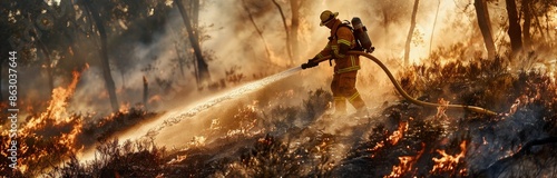 firefighter, wildfire, forest, fire, flames, hose, water, smoke, danger, heat, safety, equipment, battle, blaze, emergency, protect, extinguish, damage, rescue, timberland, tree, burn, nature, hazard, environment, disaster, destruction, climate change, global warming, summer, drought, impact, response, fight, save, hero, courage, bravery