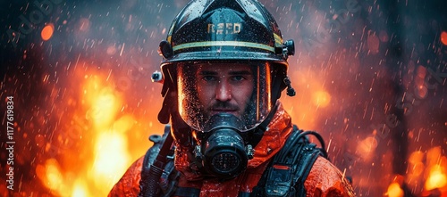 firefighter, fire, flames, rain, water, helmet, gear, courageous, brave, rescue, emergency, danger, protection, safety, uniform, man, face, serious, intense, action, dramatic, scene, blaze, inferno, struggle, effort, duty, service, risk, sacrifice, strength, resilience, determination, powerful, heroic, fearless, professional, occupation, job, career, person, portrait, image, photograph