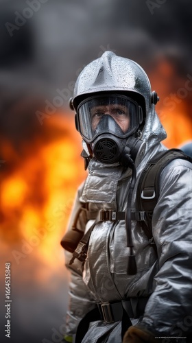 Firefighter in full protective gear and gas mask