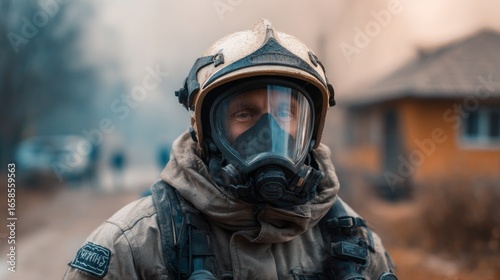 firefighter, protective, gear, rural, wildfire, emergency, smoke, helmet, mask, response, road, house, nature, firefighting, safety, rescue, team, crisis, equipment, action, hazy, landscape, community, danger, preparation, training, environmental, heat, flames, urgency, mission, help, management, teamwork, assistance, alert, wildlife, effort, service, courage, dedication, challenge, hero, bravery, visibility, disaster