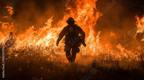 firefighter, fire, flames, smoke, helmet, night, blaze, burning, danger, heat, risk, brave, courage, safety, equipment, hose, uniform, silhouette, darkness, orange, yellow, glow, spark, ember, intensity, destruction, emergency, brush, forest, field, grass, landscape, nature, hot, bright, intense, dramatic, action, rescue, protect, hero, work, job