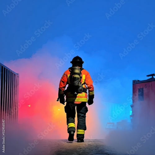 firefighter, smoke, fire, city, night, danger, emergency, rescue, hero, brave, courage, protection, safety, uniform, building, darkness, red, blue, silhouette