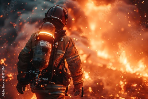firefighter, fire, blaze, flames, spark, oxygen, tank, gear, protective, helmet, smoke, heat, danger, courage, bravery, rescue, emergency, incident, response, safety, department, fighting, hydrant, hose, ladder, extinguisher, detector, alarm, burning, intense, dramatic, silhouette, backlit, dangerous, brave, hero, plume, scene, firefighting, responder, first, service